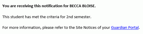 NOTE: When each option is enabled, a new Send Notifications link will be available when processing each of these actions (i.e., Site Tools/Attendance Letter Calculation, Site Tools/Determine Eligibility Status, Student Maintenance/By Year/Discipline or Student Reports/Grade Cards).The Send Notifications option will send an email to the Primary Guardian's default email. If the Primary Guardian does not have a default email, the associated report will be printed instead for that Student. A record of the Notification is also saved/updated each time the Send Notifications action is processed. Those notifications can be viewed/deleted in the Student Maintenance/Notifications tab. The Guardian and Student will also have access to the Notifications in the Site Notices of the Guardian/Student Portal. The Site Notices are displayed for 14 days from the Date Sent.